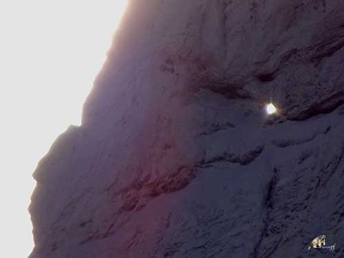 Mais combien plus précieux pour nous aujourd'hui que l'aperçu semestriel des rayons du soleil à travers le Heiteloch et du Gletcherlücke, qui offre une vue magnifique sur le Fiescherwand et le Finsteraarhorn ! L'image de la Fiescherwand au clair de lune argenté est d'une beauté surnaturelle. Et le dernier salut du soleil brillant sur le sommet rougeoyant du Finsteraarhorn, alors que les ombres du soir se trouvent déjà dans la vallée, est merveilleux.